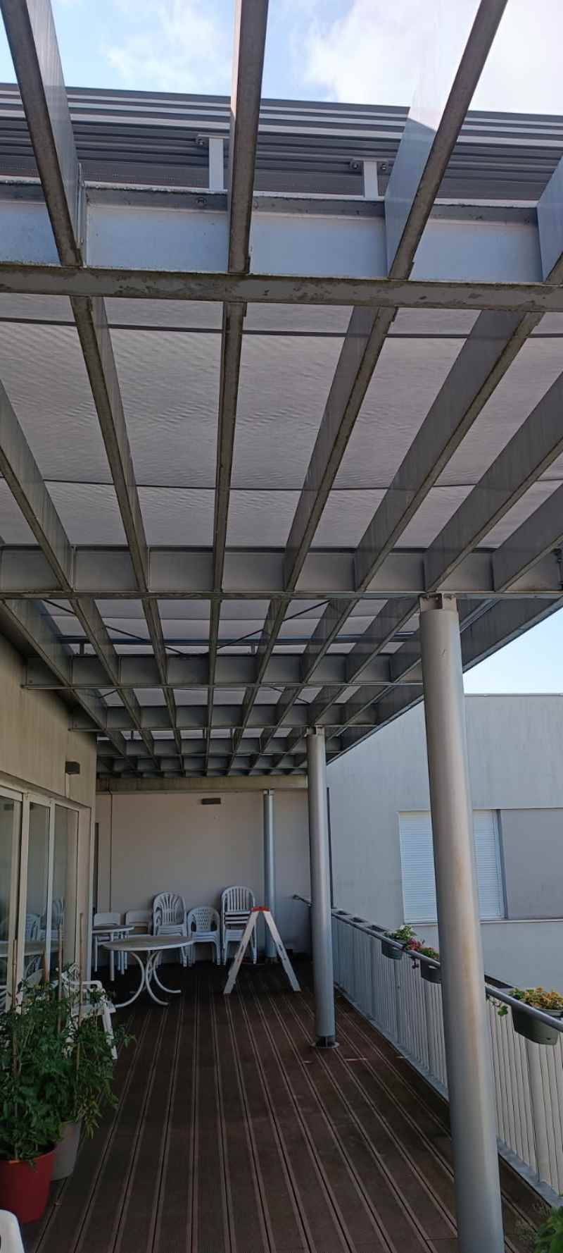 Le Carport de Veranco modèle Jade est une structure à toiture plate avec des panneaux sandwich ou du vitrage feuilleté en toiture, un chéneau périphérique est présent sur ce car port afin d’assurer l’écoulement