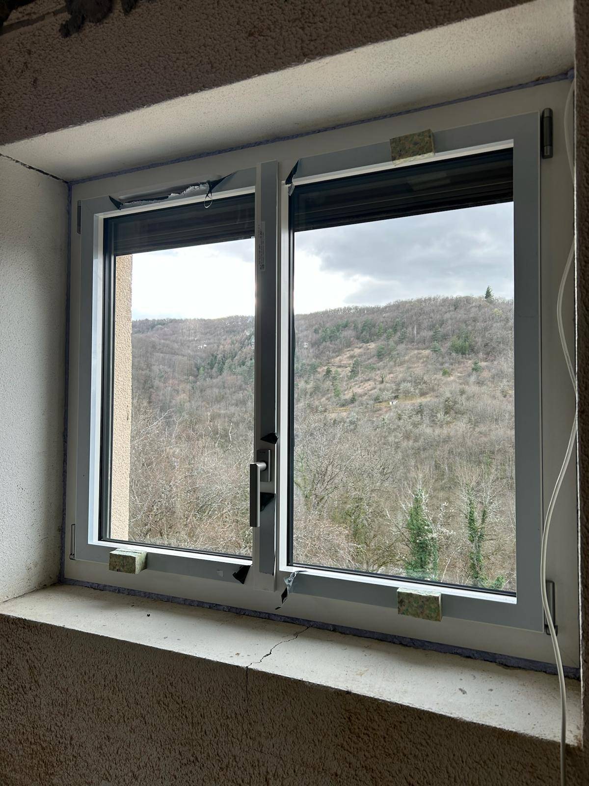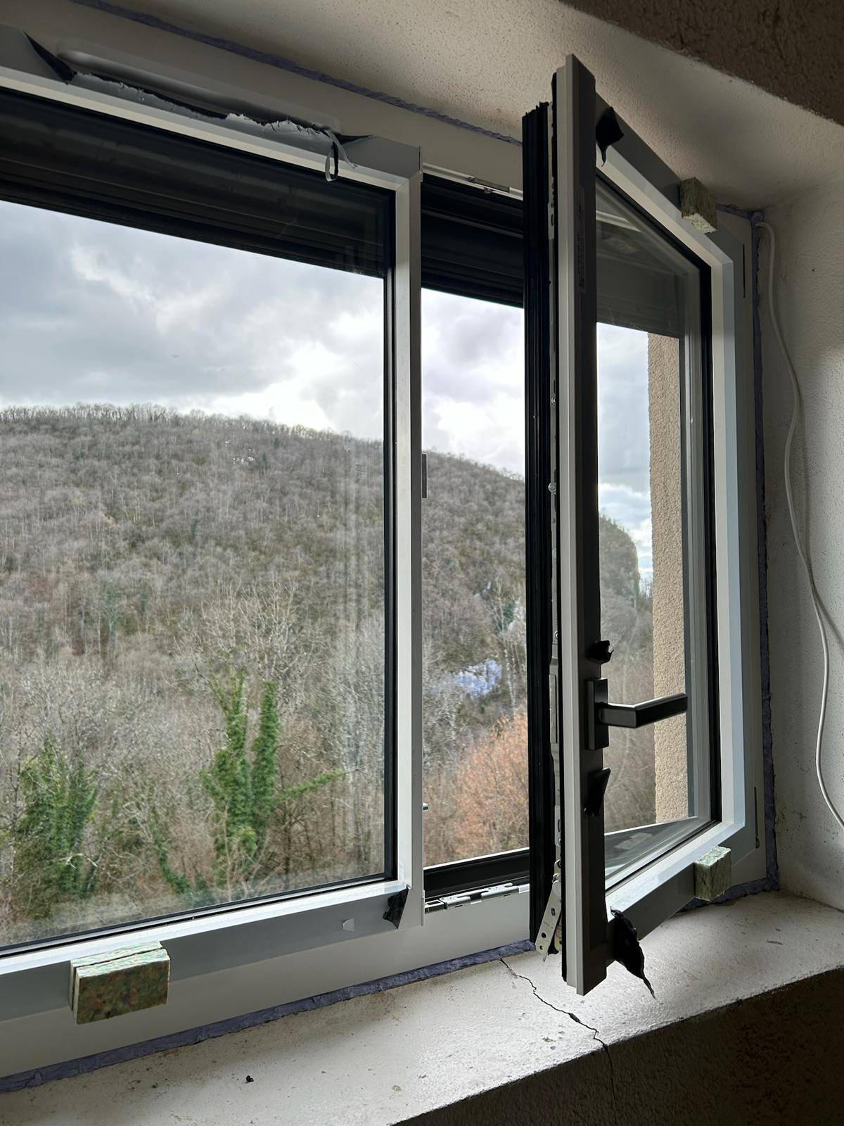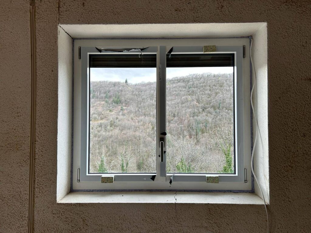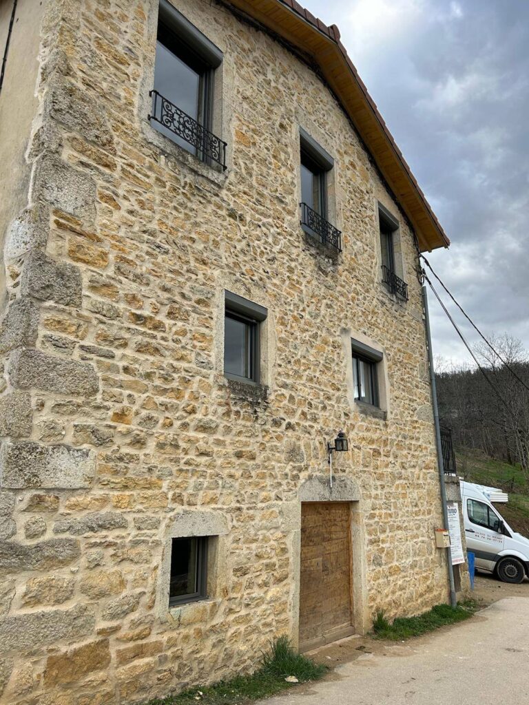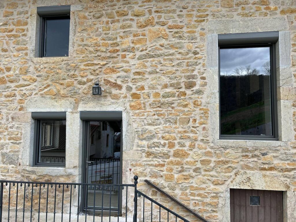 Les fenêtres et portes-fenêtres de la marque K-Line qu’il a choisies en aluminium blanc intérieur et grisse marient parfaitement avec la façade en pierre. Comme vous pouvez le voir sur les photos prises par notre équipe.