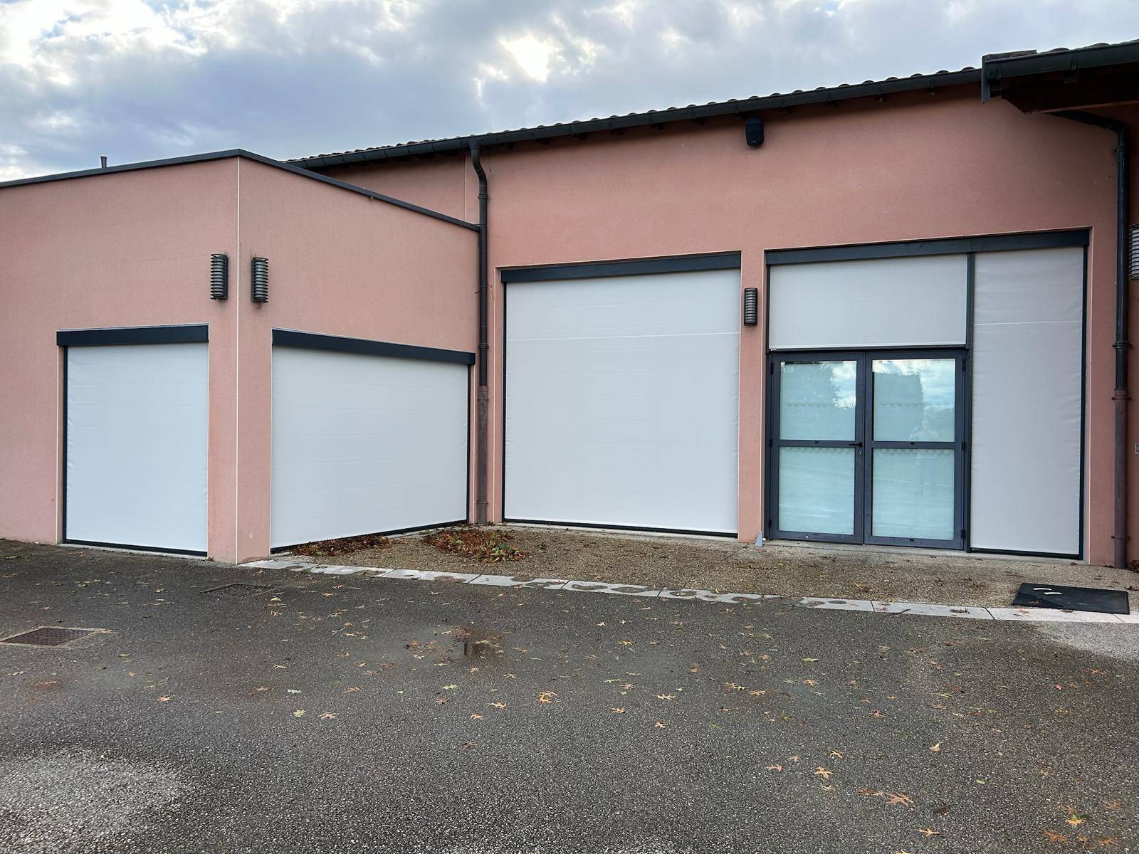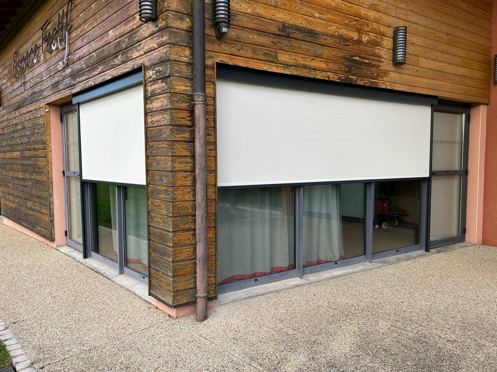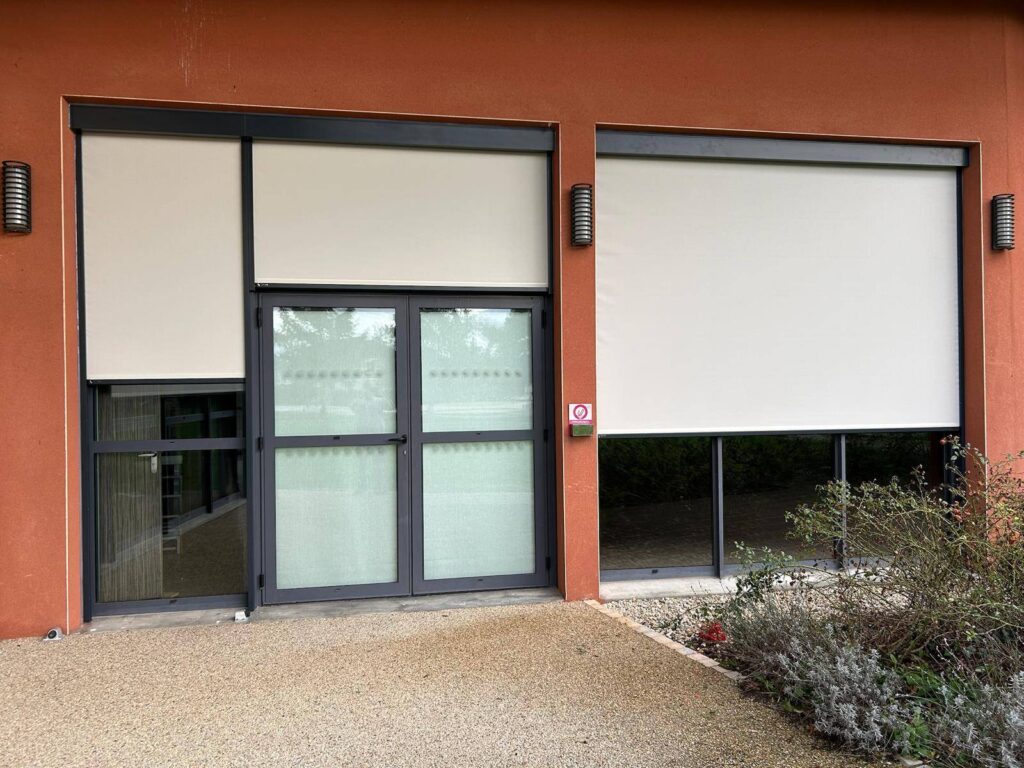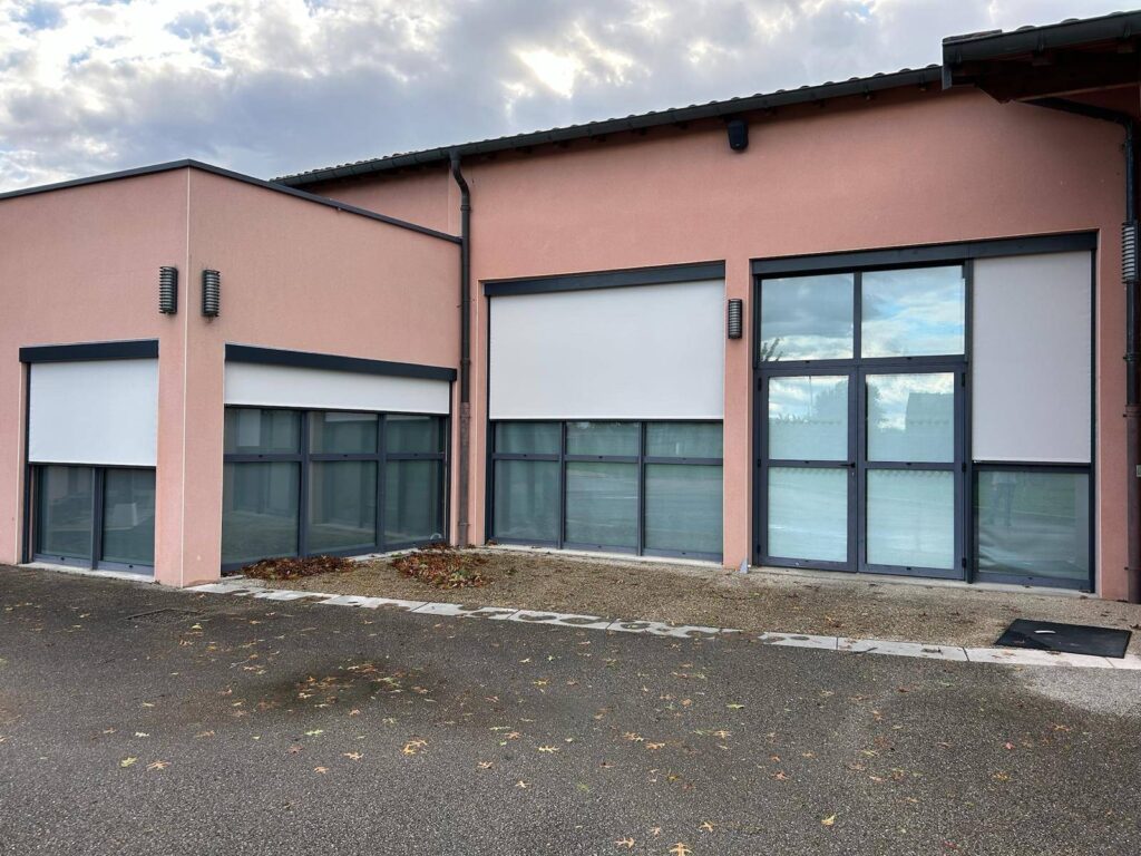 Installation de stores screens zippés extérieurs sur mesure, toile beige et structure gris anthracite, à la salle des fêtes d’Etrez (01)