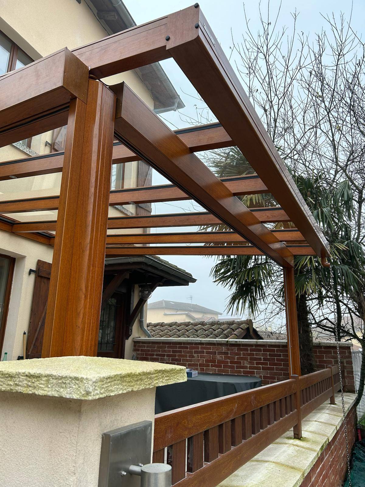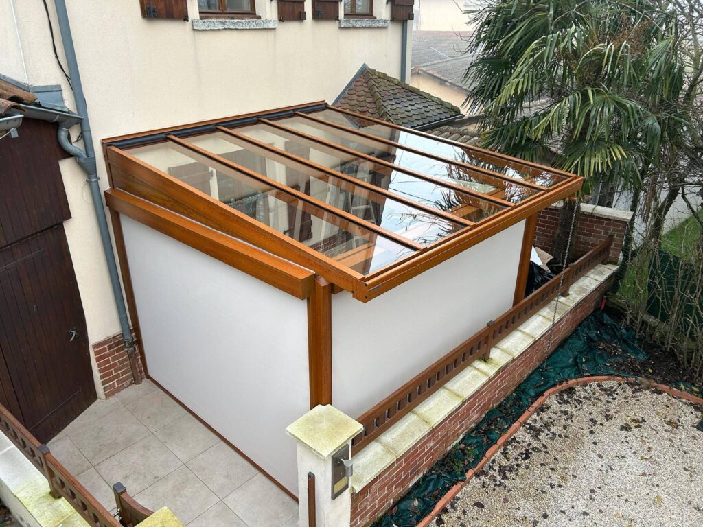 Nous leur avons conseillé l’installation d’une pergola SAPHIR sur mesure, en « faux angles », avec vitrages en trapèzes, de couleur chêne doré avec une toiture en verre.