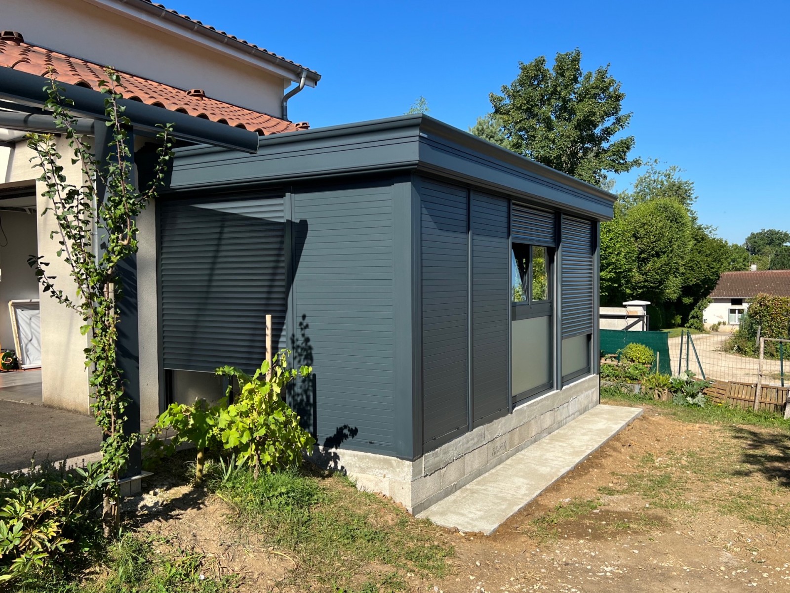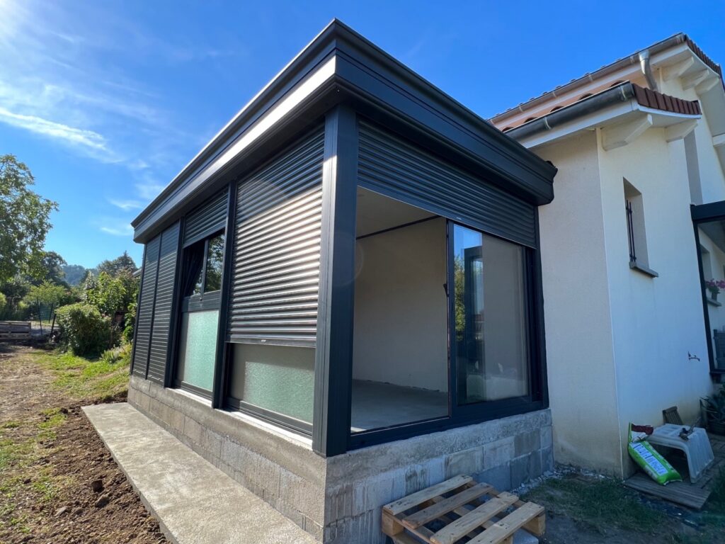 Installation d’une véranda à toit plat ONYX avec volets roulants à Val Revermont (01426)