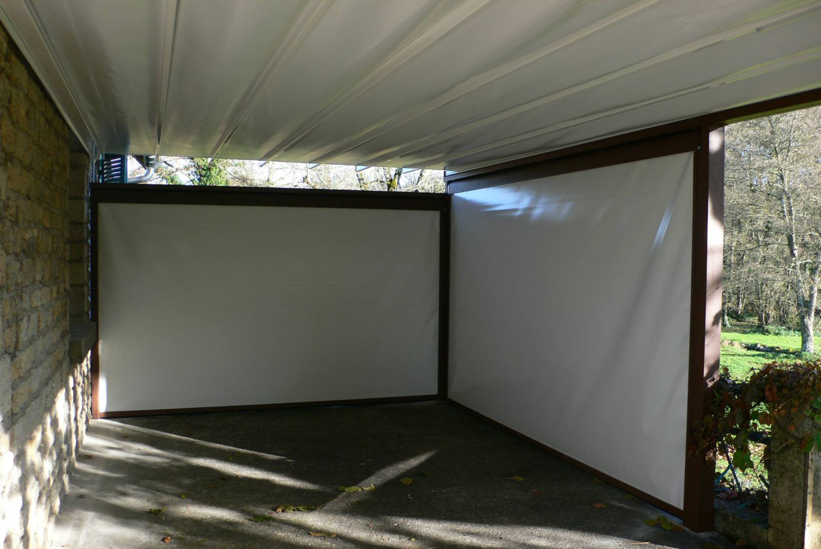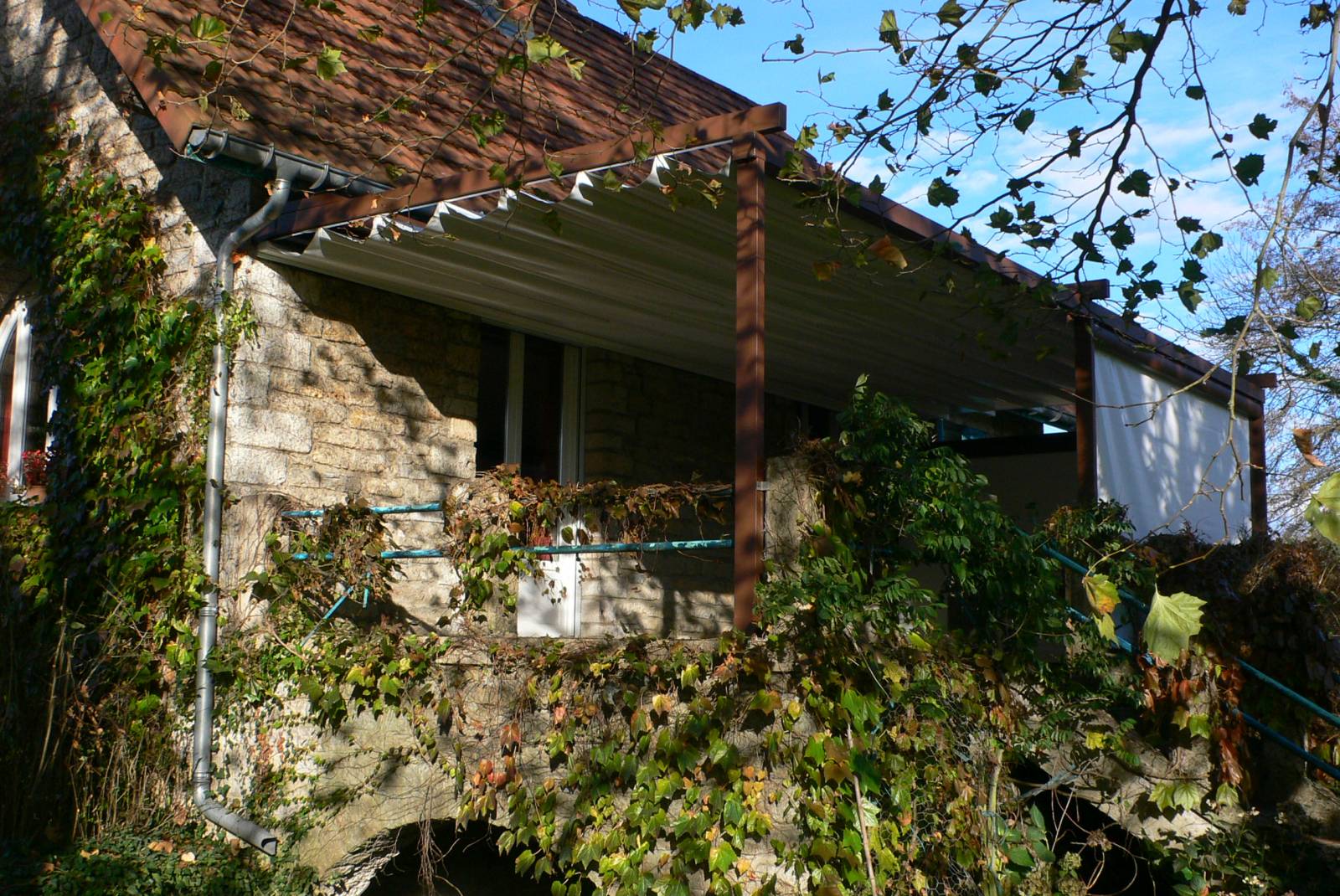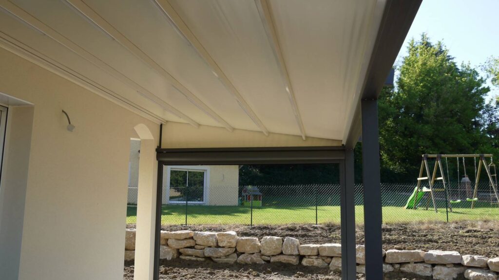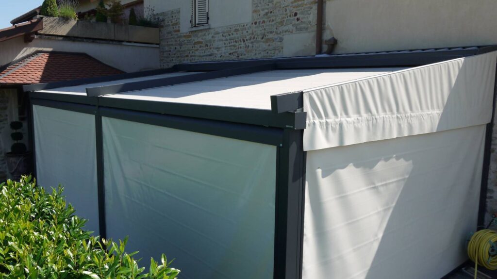 La pergola Pergostore est une structure à poser en applique sur un mur avec une toile en suspension tendue et système anti-gouttes, une pente de toit est à respecter pour une bonne évacuation des eaux. Cependant une toile ondulée en option est possible pour une pente de toit inférieure à celle demandée jusqu’à l’horizontal.