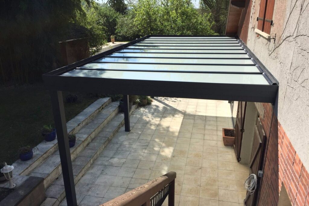 La pergola de VERANCO modèle Jade, Est une pergola à toiture plate avec du vitrage en toiture ou des panneaux isolants, un chéneau périphérique est présent sur cette pergola afin d’assurer l’écoulement des eaux prevu dans les poteaux avec une descente en PVC.