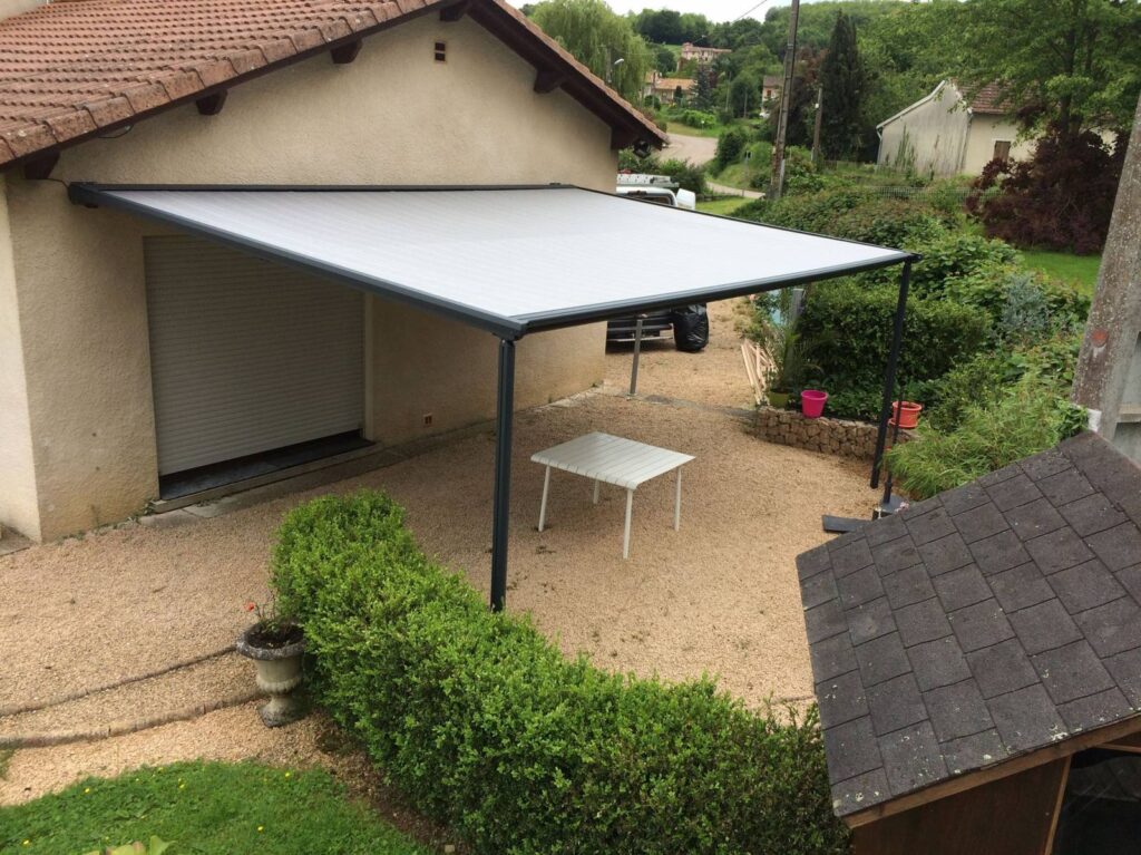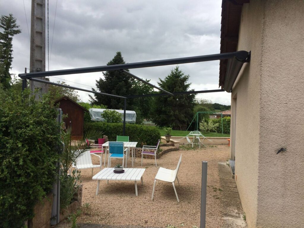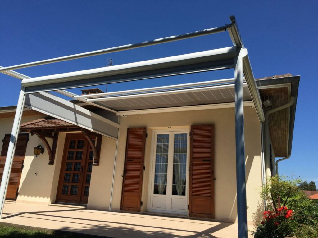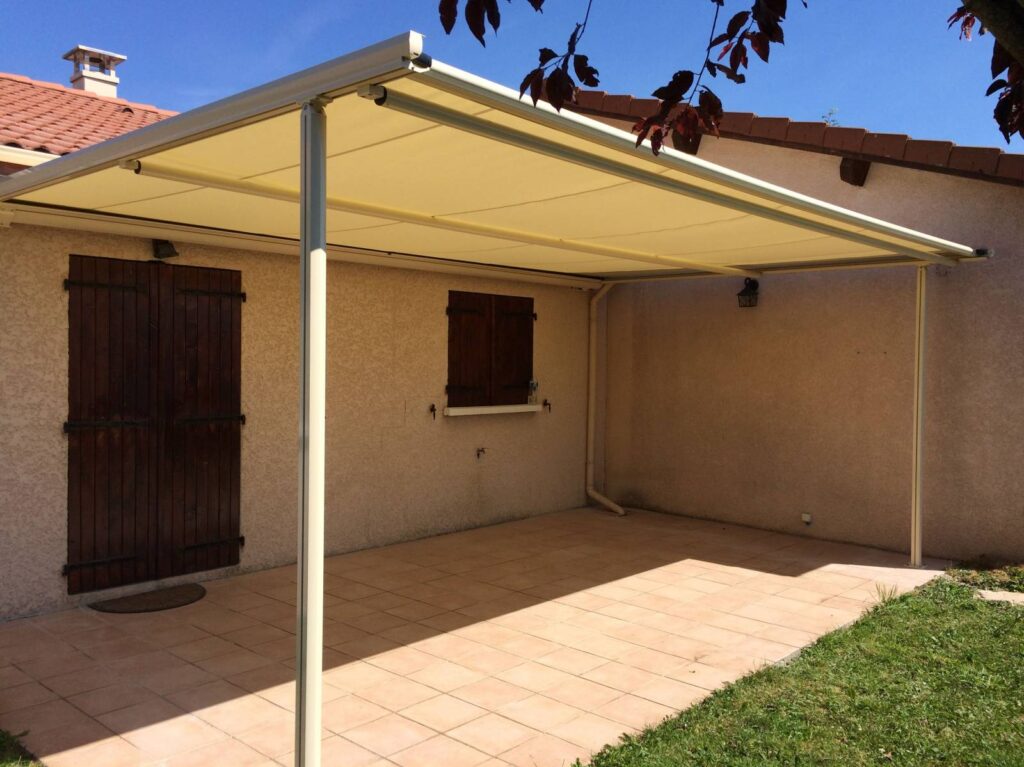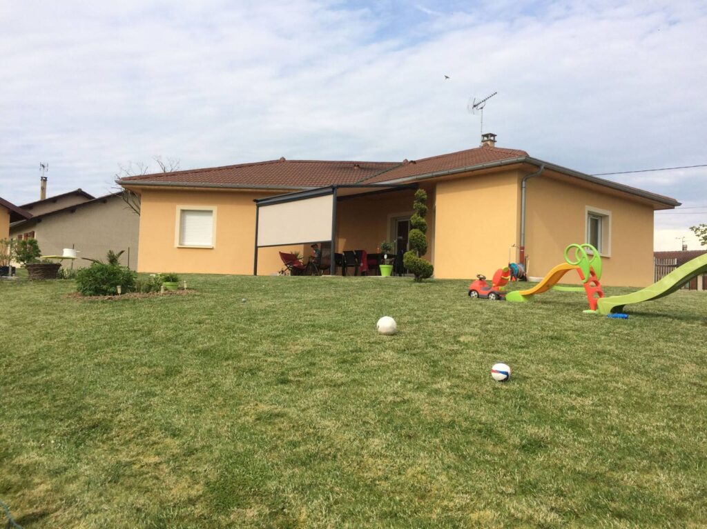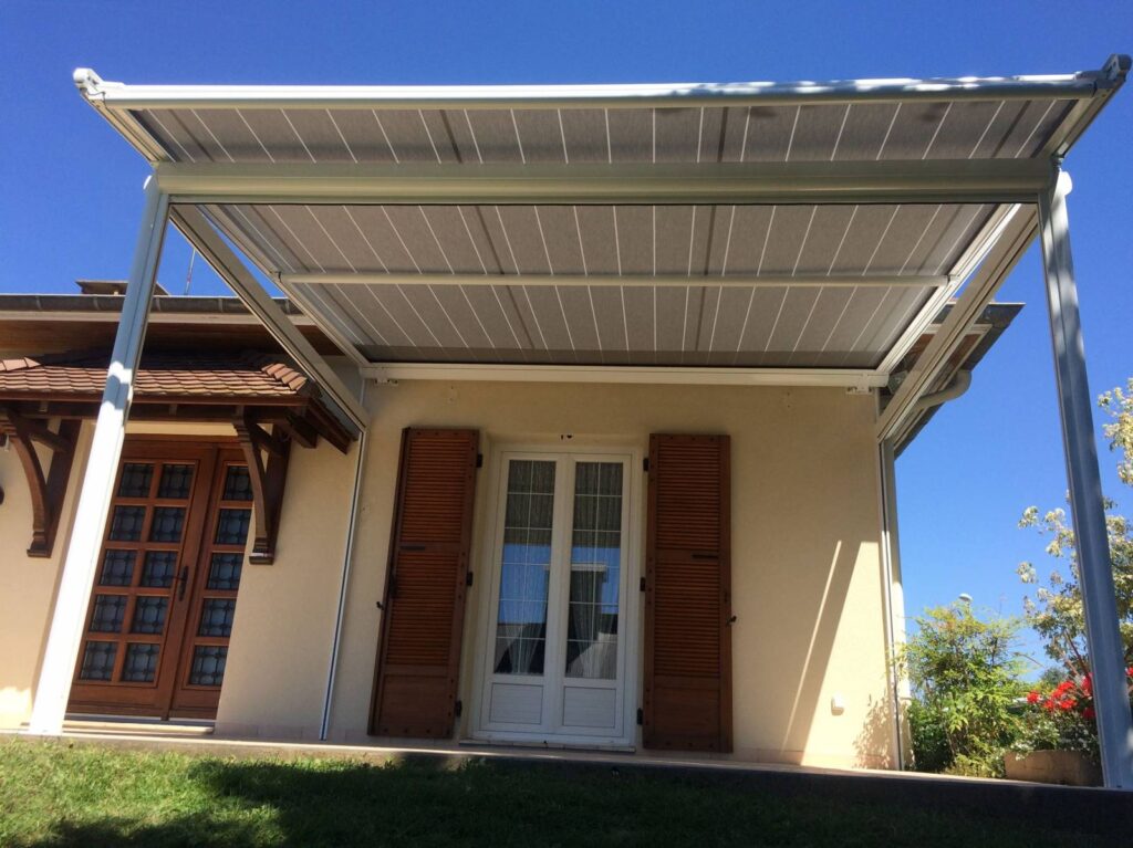 Cette pergola permet de créer un espace sur terrasse contribuant à profiter pleinement de l’extérieur en bénéficiant de la zone d’ombre nécessaire au meilleur confort en été. Le store de toiture est enroulable et disparaît complètement dans son coffre, la tension de la toile est assurée par un système garantissant son meilleur maintien aux vents connus dans l’Ain.