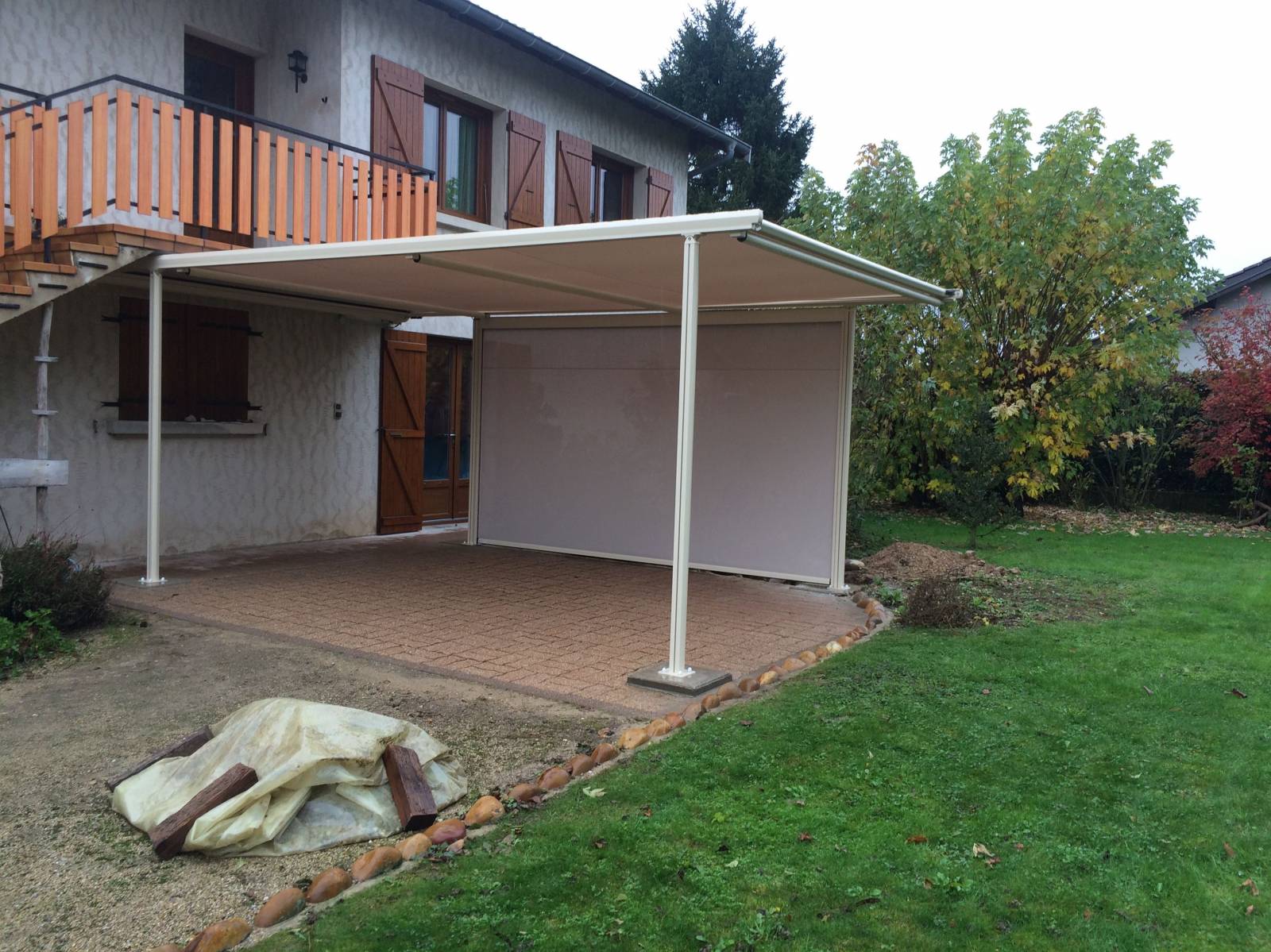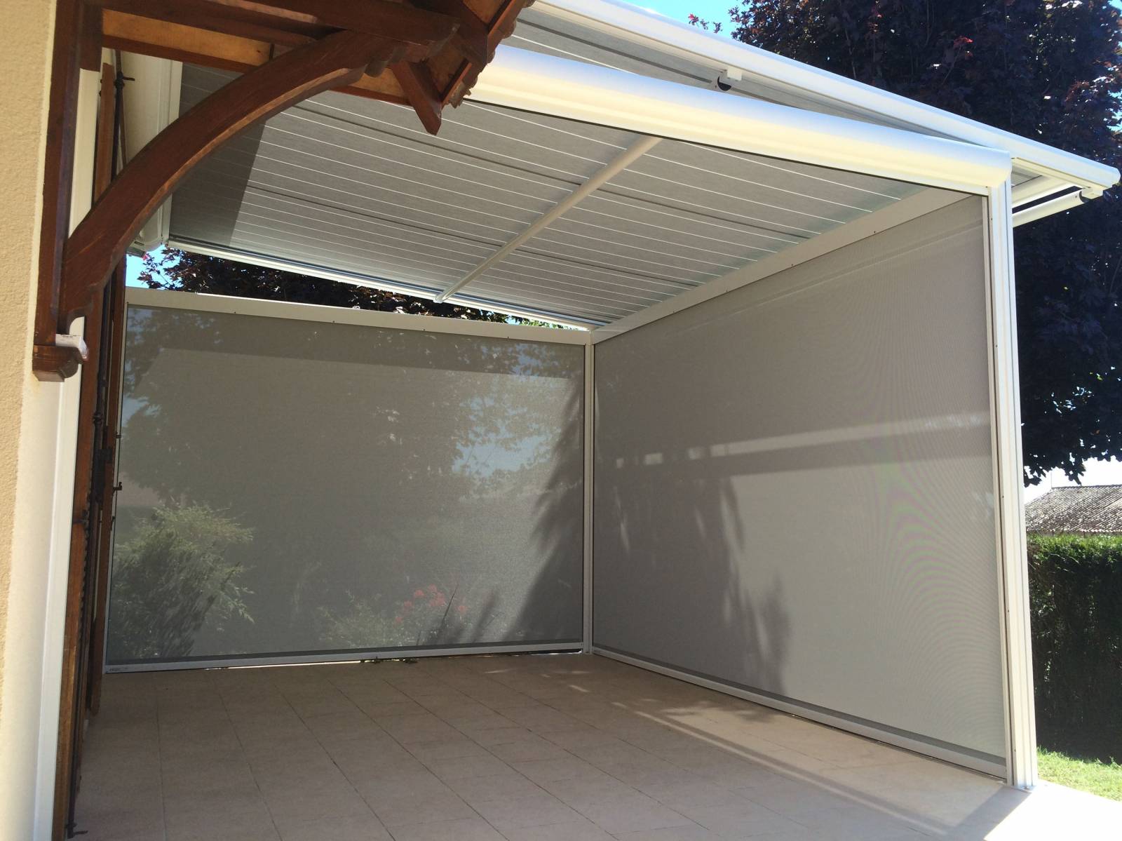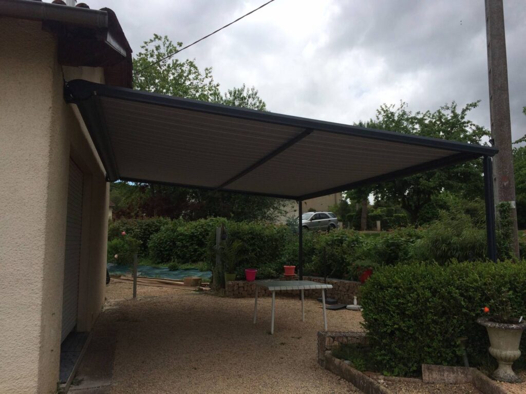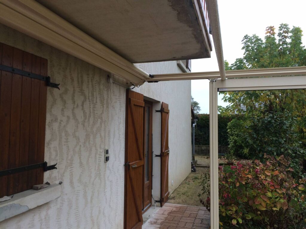 Cette pergola permet de créer un espace sur terrasse contribuant à profiter pleinement de l’extérieur en bénéficiant de la zone d’ombre nécessaire au meilleur confort en été. Le store de toiture est enroulable et disparaît complètement dans son coffre, la tension de la toile est assurée par un système garantissant son meilleur maintien aux vents connus dans l’Ain.