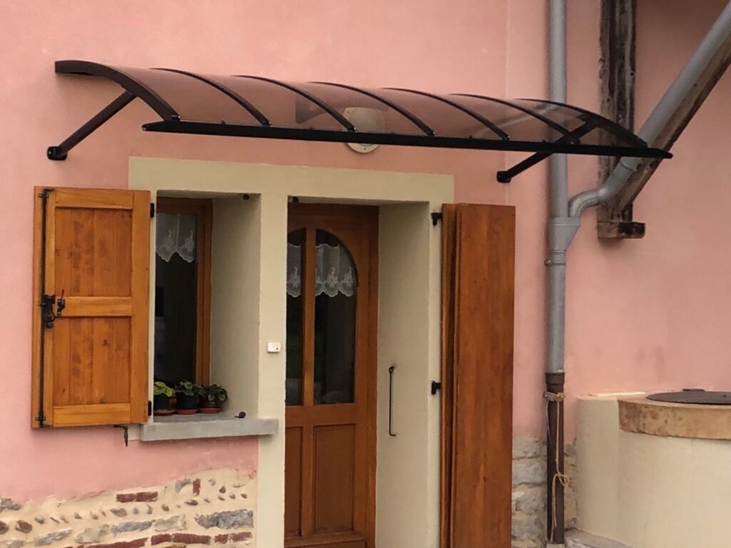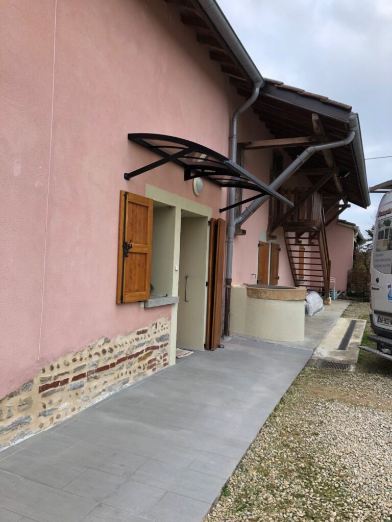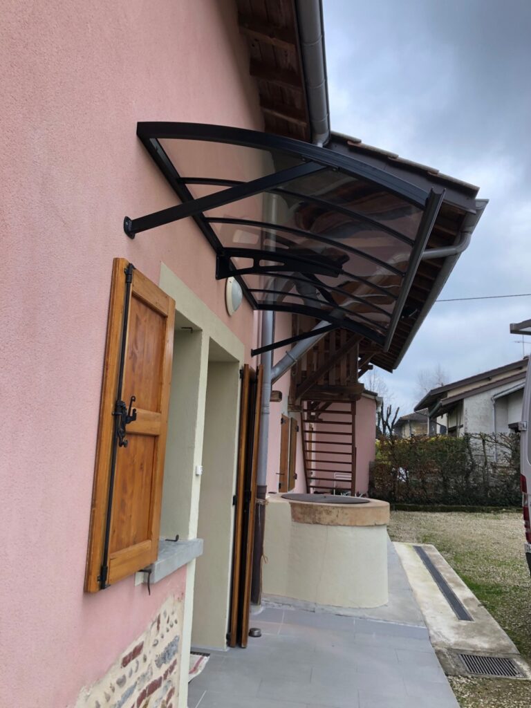 Cette marquise est fabriquée sur-mesure en aluminium avec un esthétique reprenant le fer forgé comme à l’ancien temps, pour respecter l’insertion sur cette façade d’une vieille ferme rénovée dans l’Ain à Buellas.