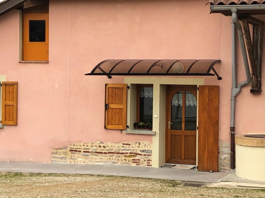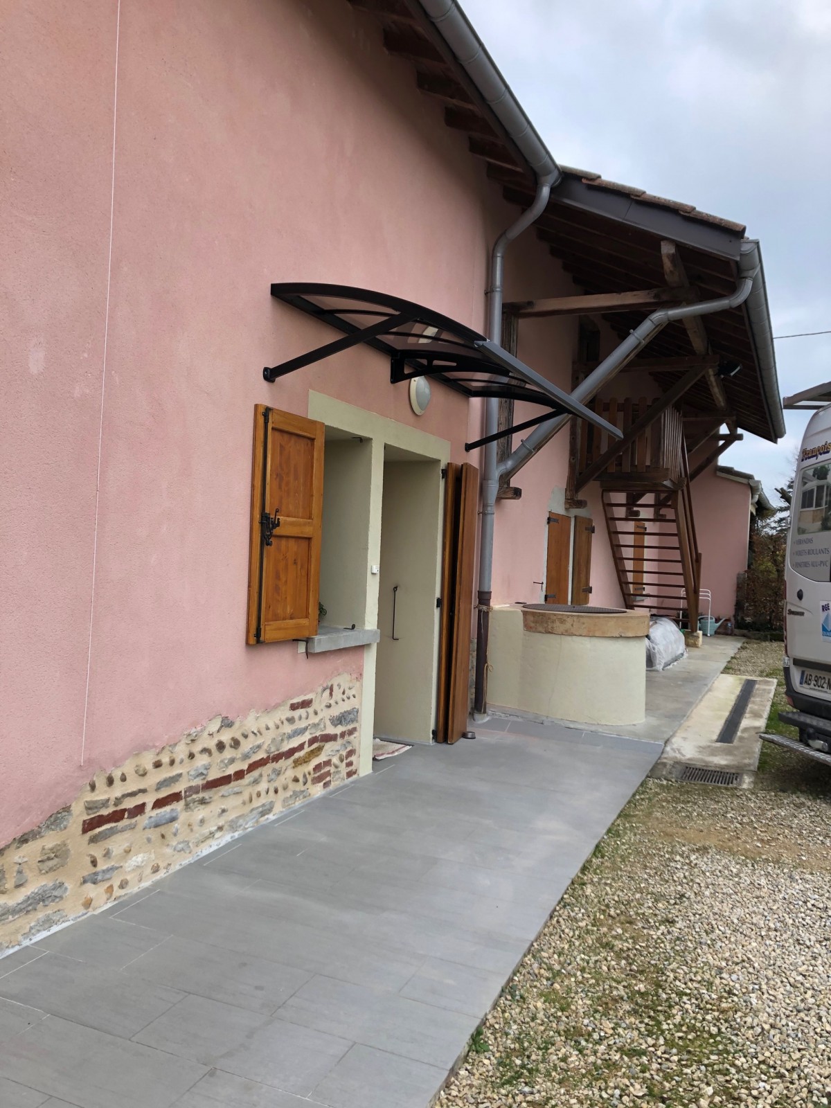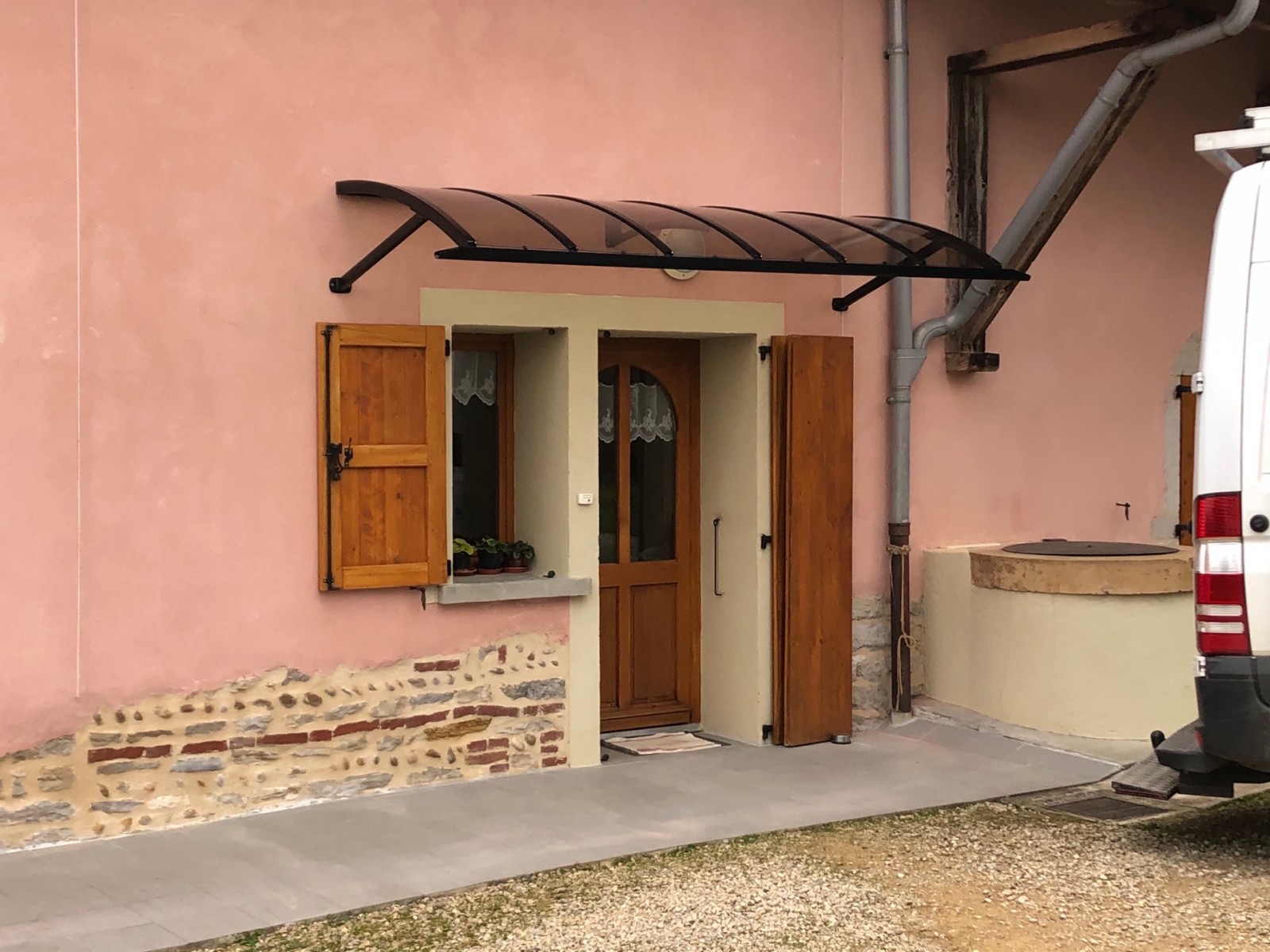 Une Marquise sur-mesure afin de ne pas trop diminuer la luminosité de la fenêtre et de la porte d’entrée qu’elle protège. Elle permet de protéger la façade de cette ferme de Buellas des intempéries car auparavant, la toiture était trop élevée.