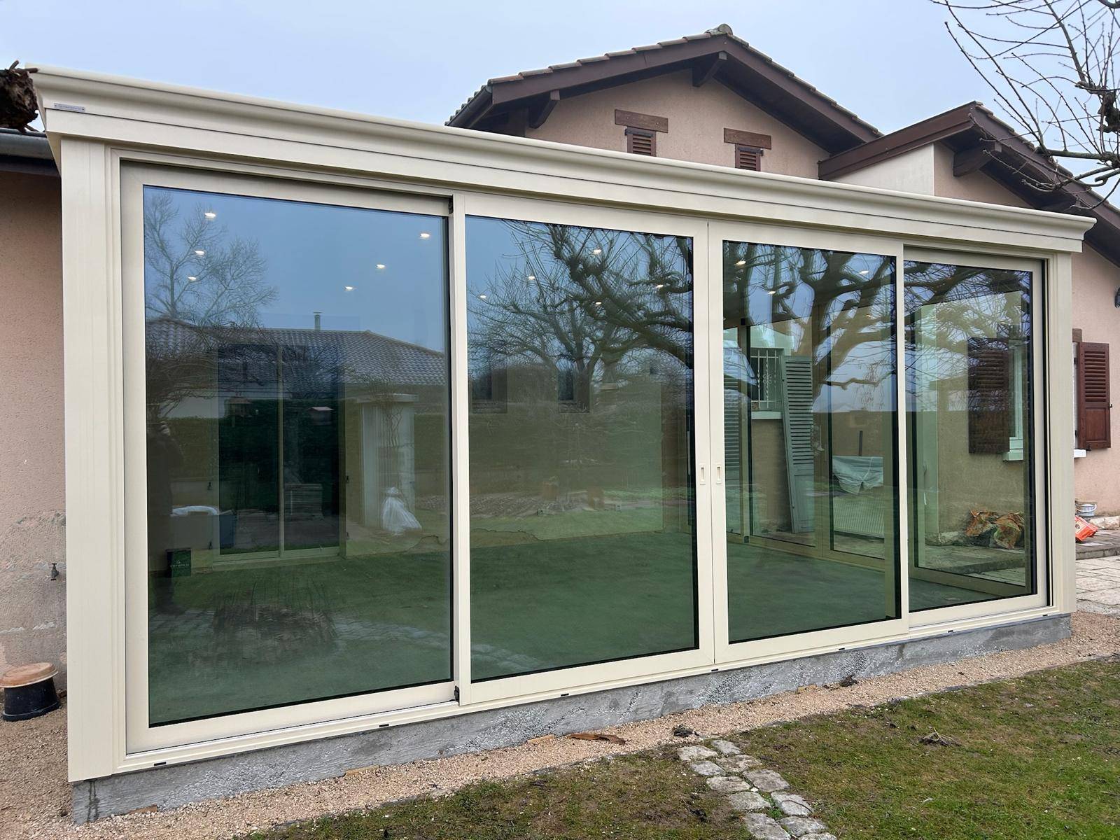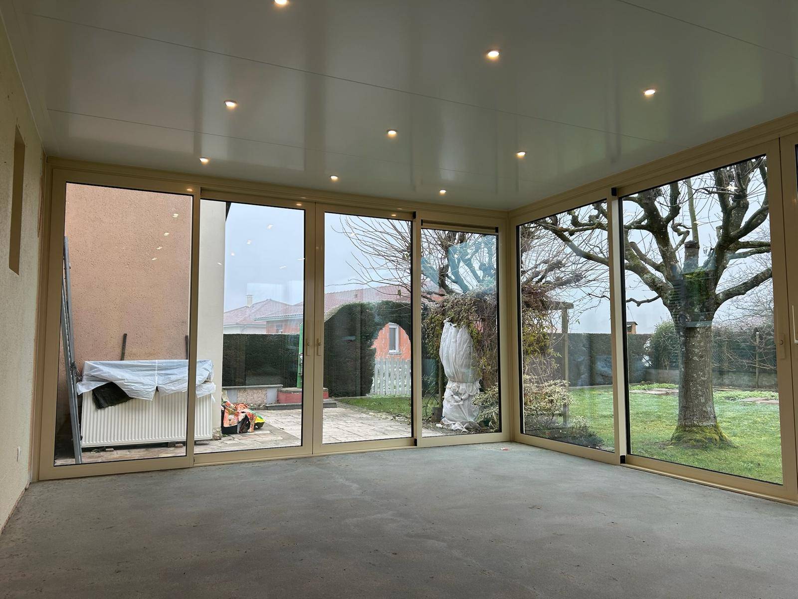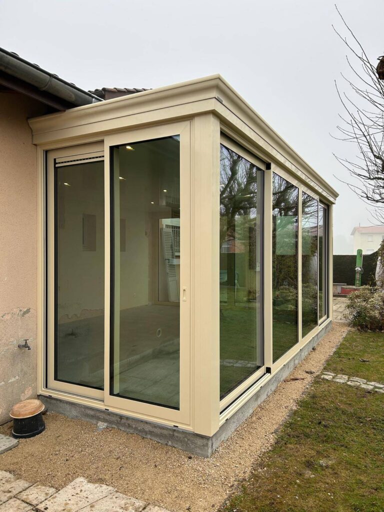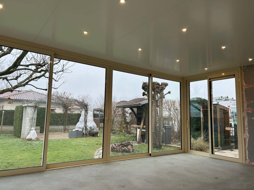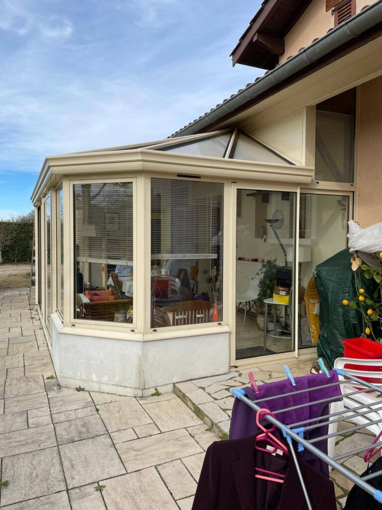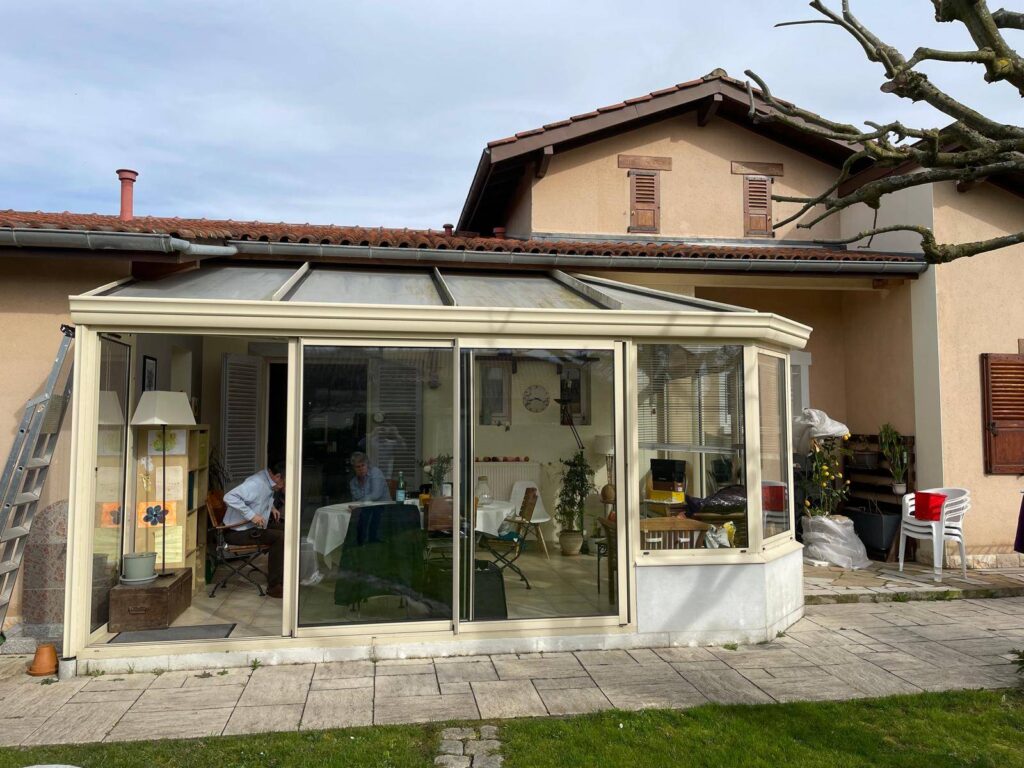 Pose d’une véranda ONYX très haute isolation de la marque VERANCO à côté de Bourg-en-Bresse dans le département de l’Ain