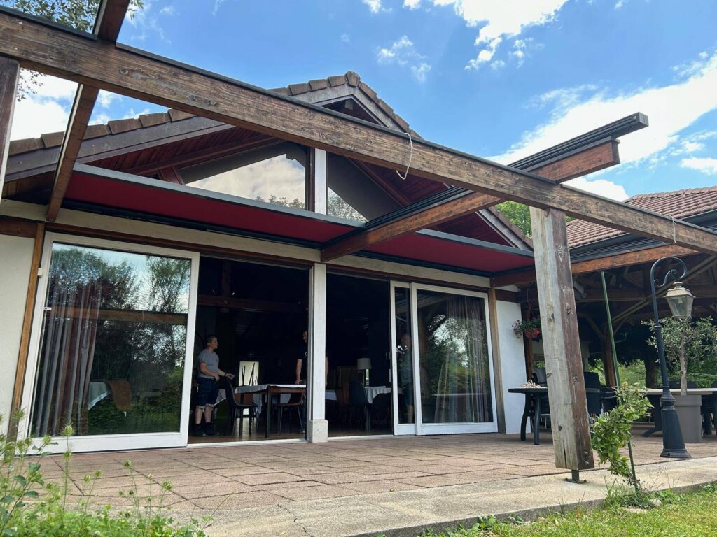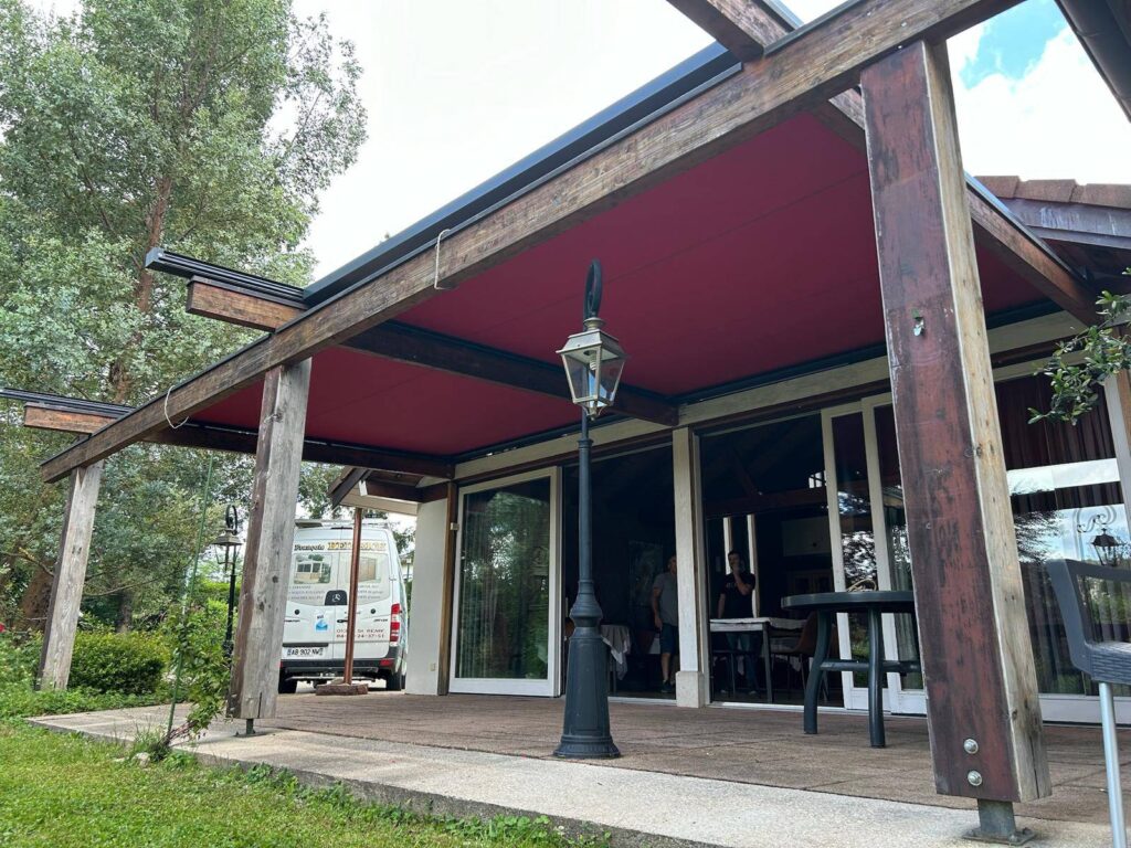 Remplacement d’un store de toiture zippé rouge à côté de Nantua pour la terrasse d’un restaurant