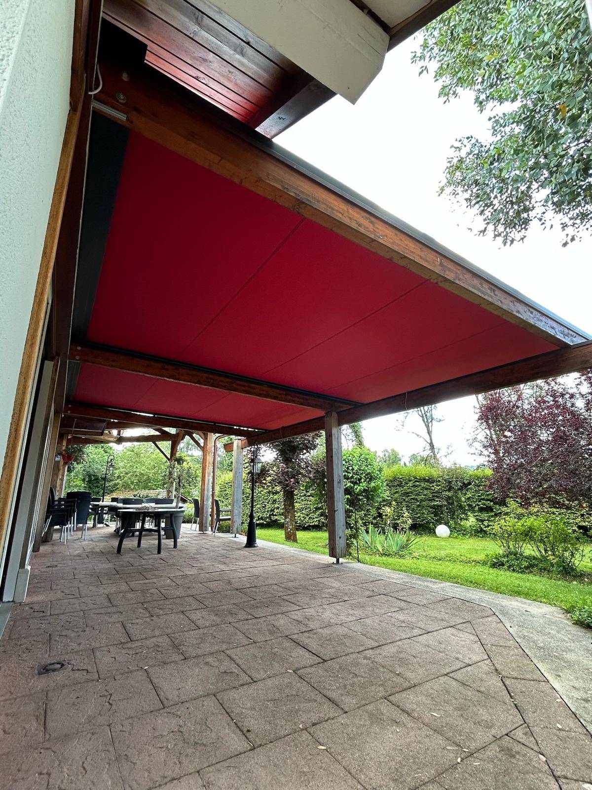 Notre client a opté pour un store zippé rouge avec une étanchéité parfaite en cas de pluie.