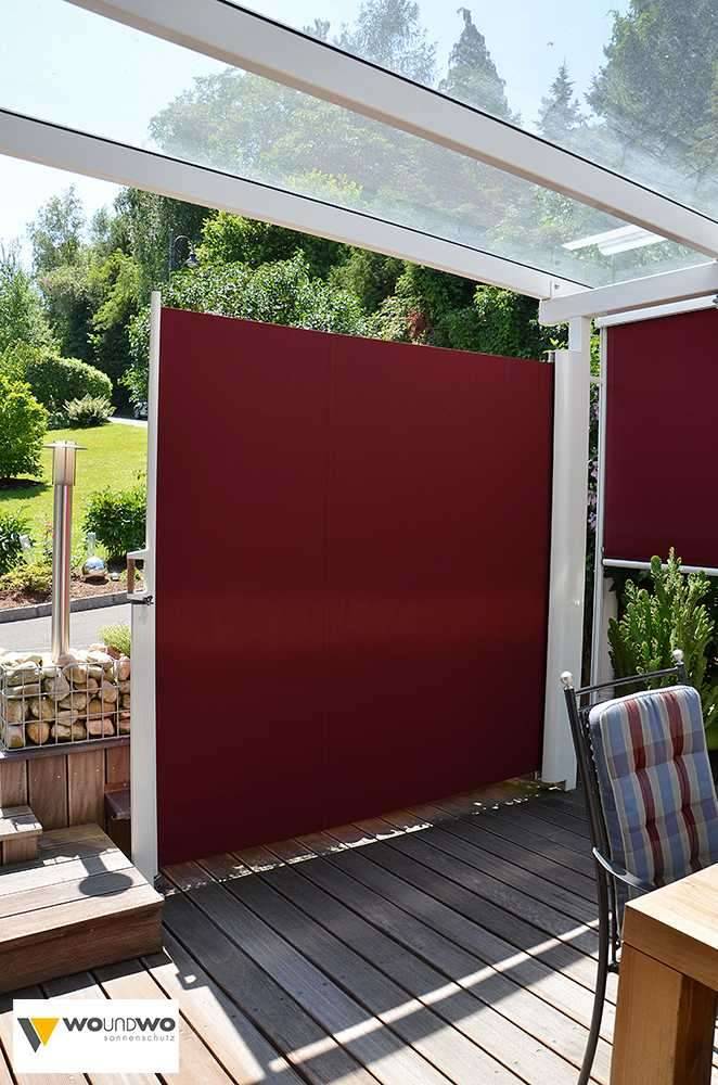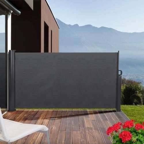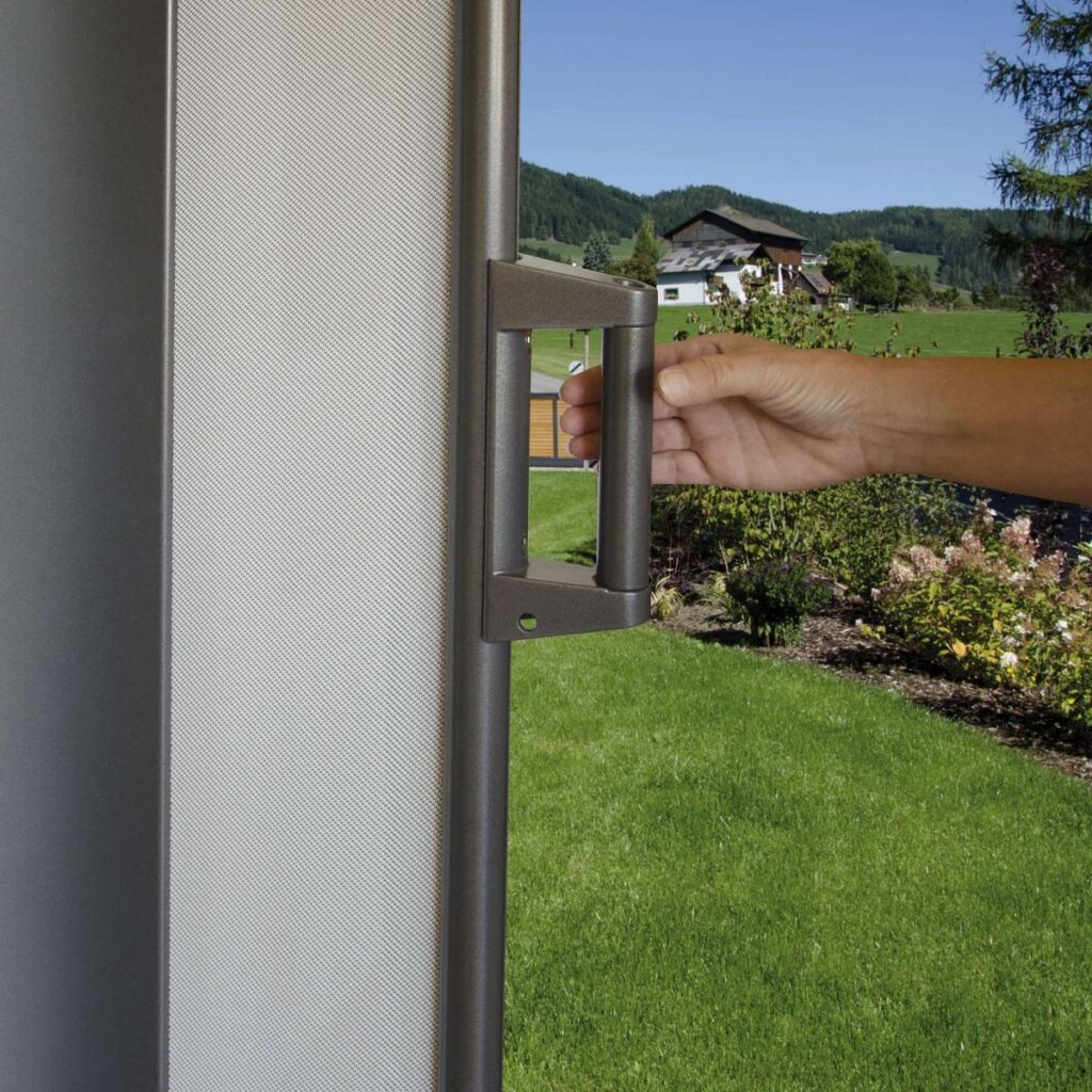 Store de paroi latérale avec un coffre aluminium laqué, ce pare-vent ou pare-vue se manœuvre manuellement et se remet en place à l’aide d’un ressort intégré. Ce coffre se fixe sur des parties rigides (mur ou structure porteuse) afin de pouvoir déployer la toile sans effort, une fois la poignée de tirage arrimée au système de sécurité, tout déverrouillage involontaire par le vent ou les animaux ou encore des enfants est impossible.