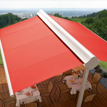 L’entreprise HEINRICH vous propose , Le Store banne avec un coffre aluminium laqué, 2 toiles déployées à l’aide de bras laqués à l’identique du coffre et 2 pieds fixés au sol. Ce