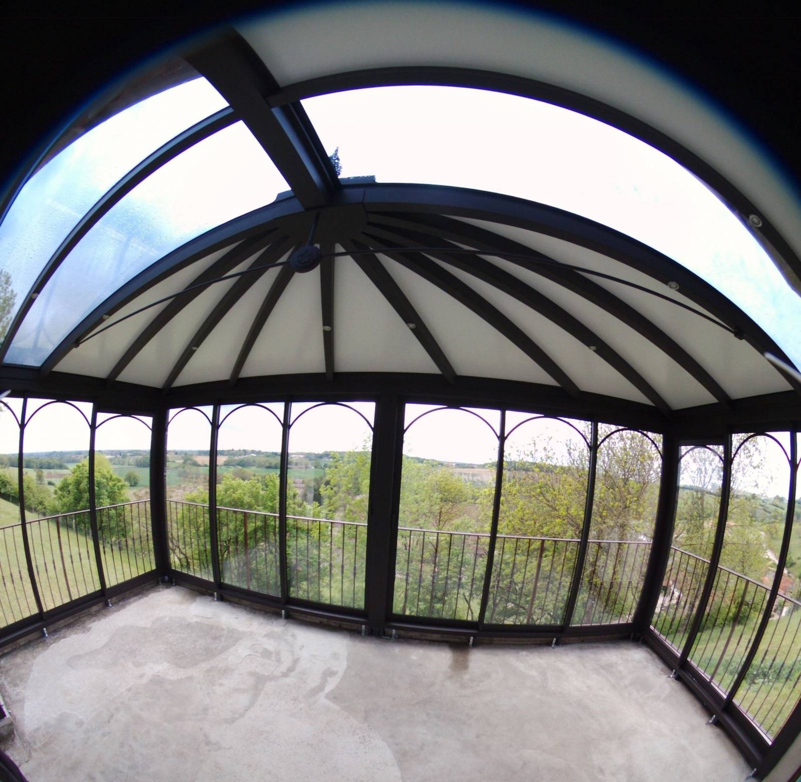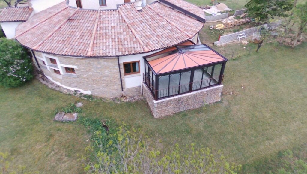 Véranda VERANCO sur des murs arrondis à Simandre sur Suran dans l’Ain – Modèle Création par l’entreprise HEINRICH