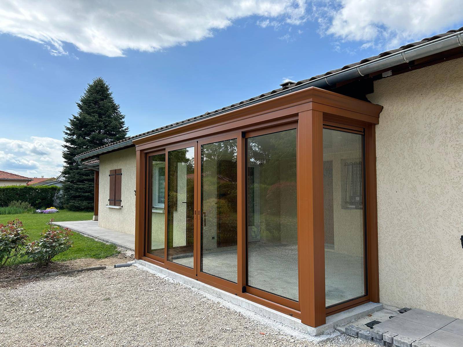 Vérandas beige en adossée à une maison ossature bois à proximité de Nantua (01)